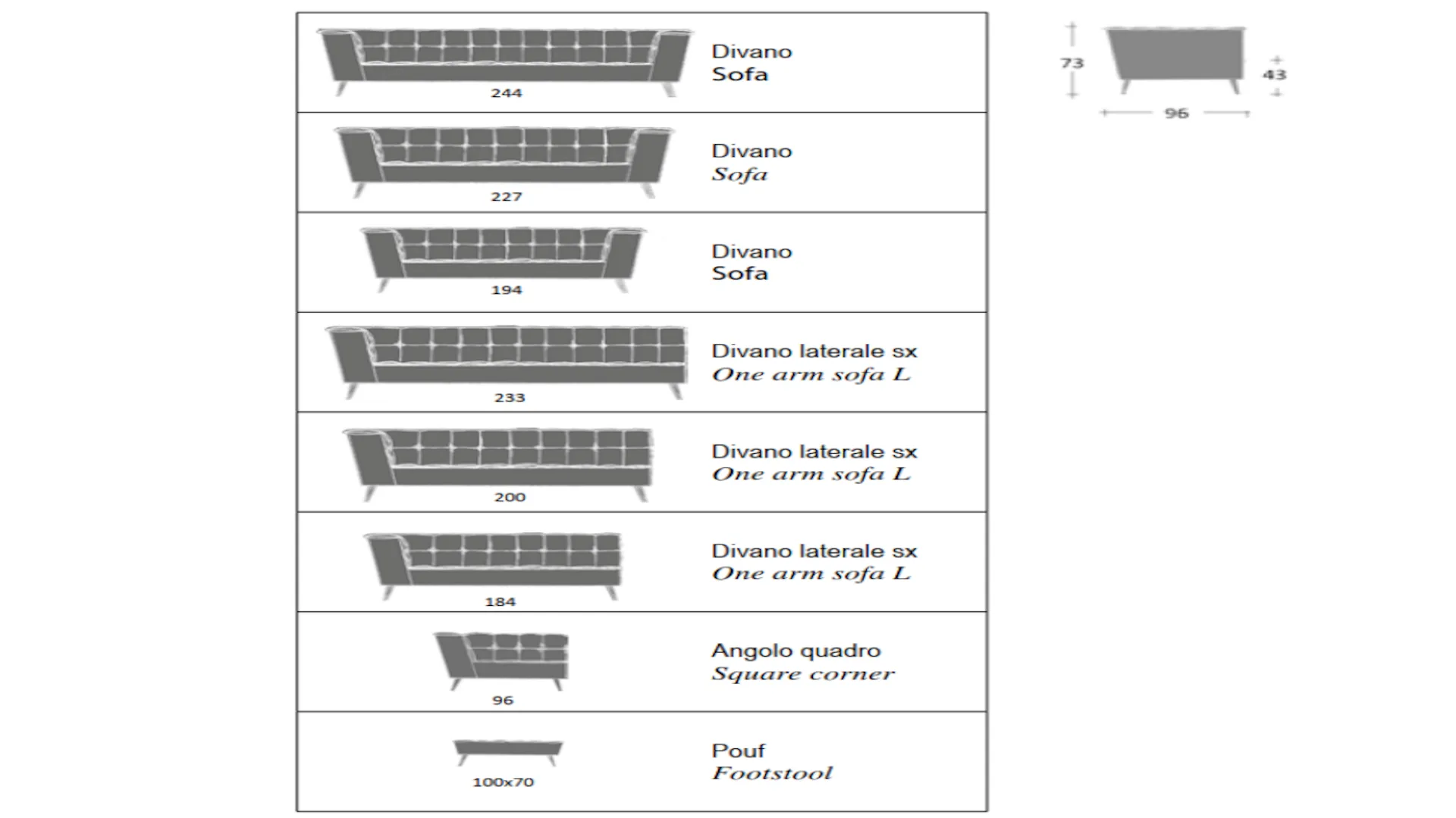 Solid fir-wood and plywood structure. Support with interwoven elastic webbing, completely covered and reinforced. Padding: different high density non defor-ming polyurethane foam. Quilt with poly-urethane foam little loose cushions, coa-ted with acrylic fiber. Feet: anthracite varnished metal.