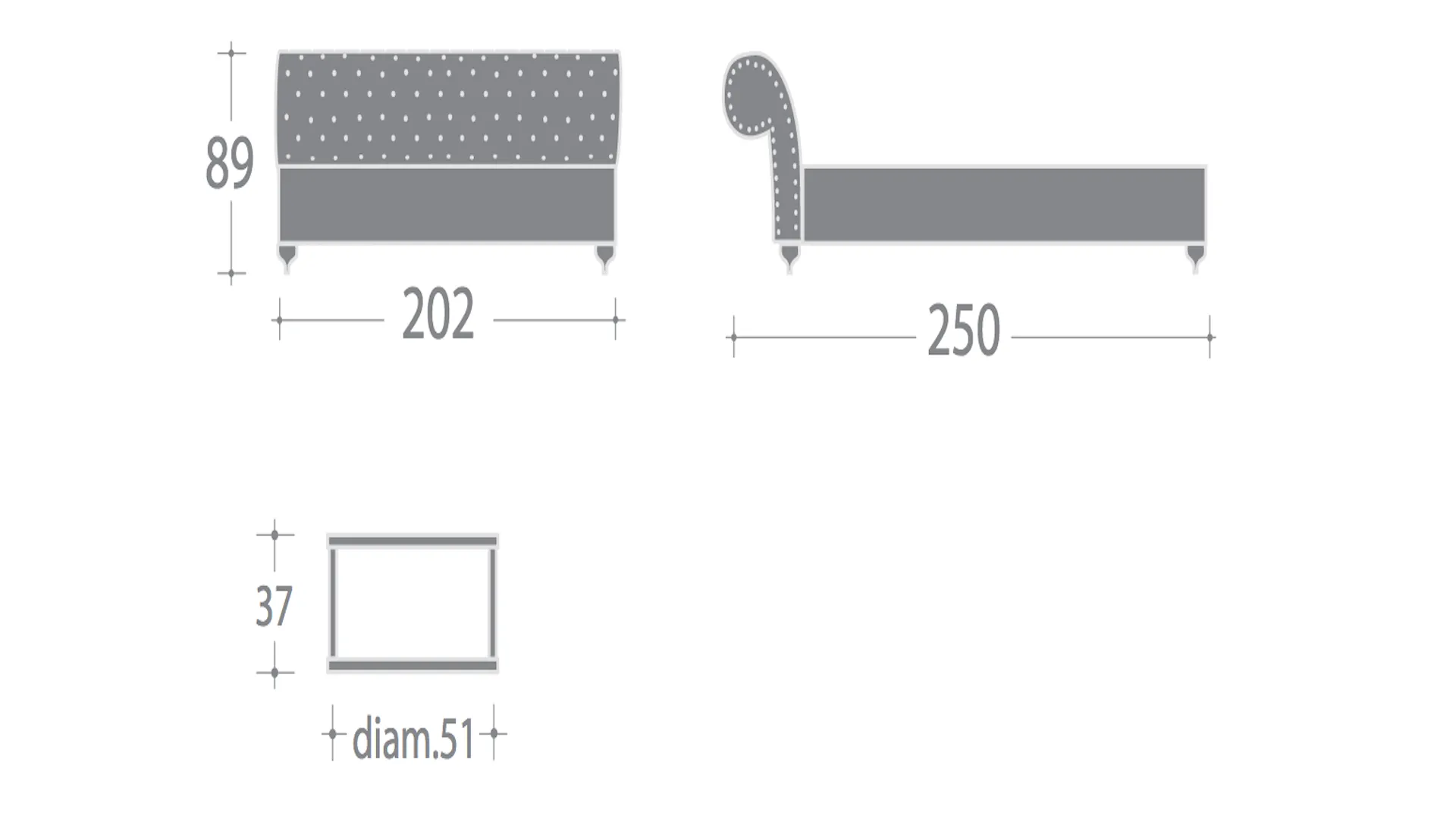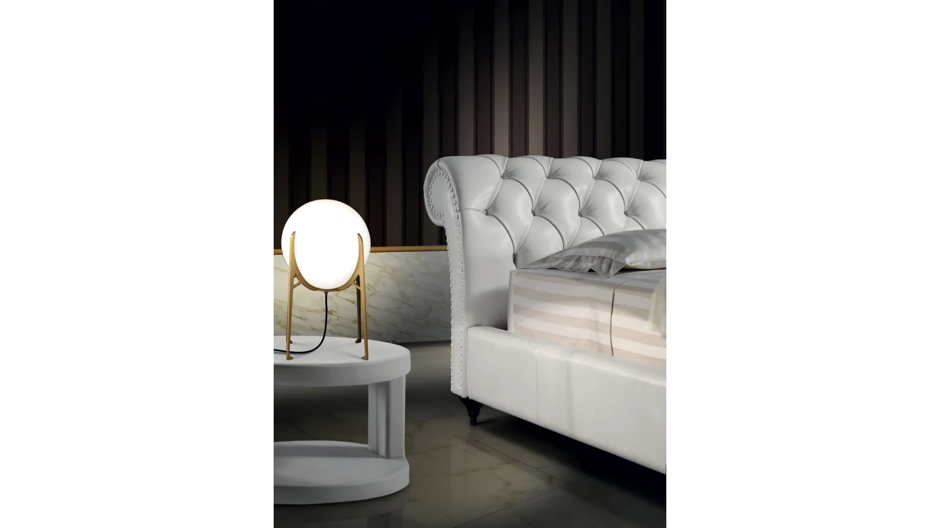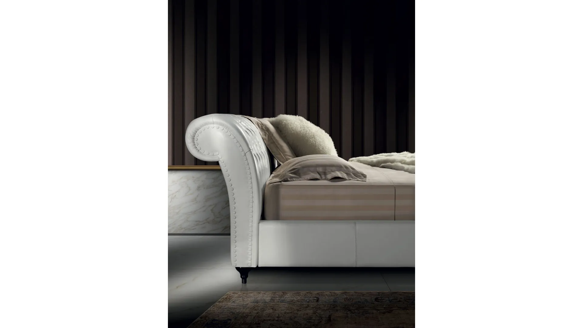 Wood frame, high densities polyurethane foam filling, covered with acrylic padding. Traditio-nal capitonné manufactoring. Aluminium feet (wood option).