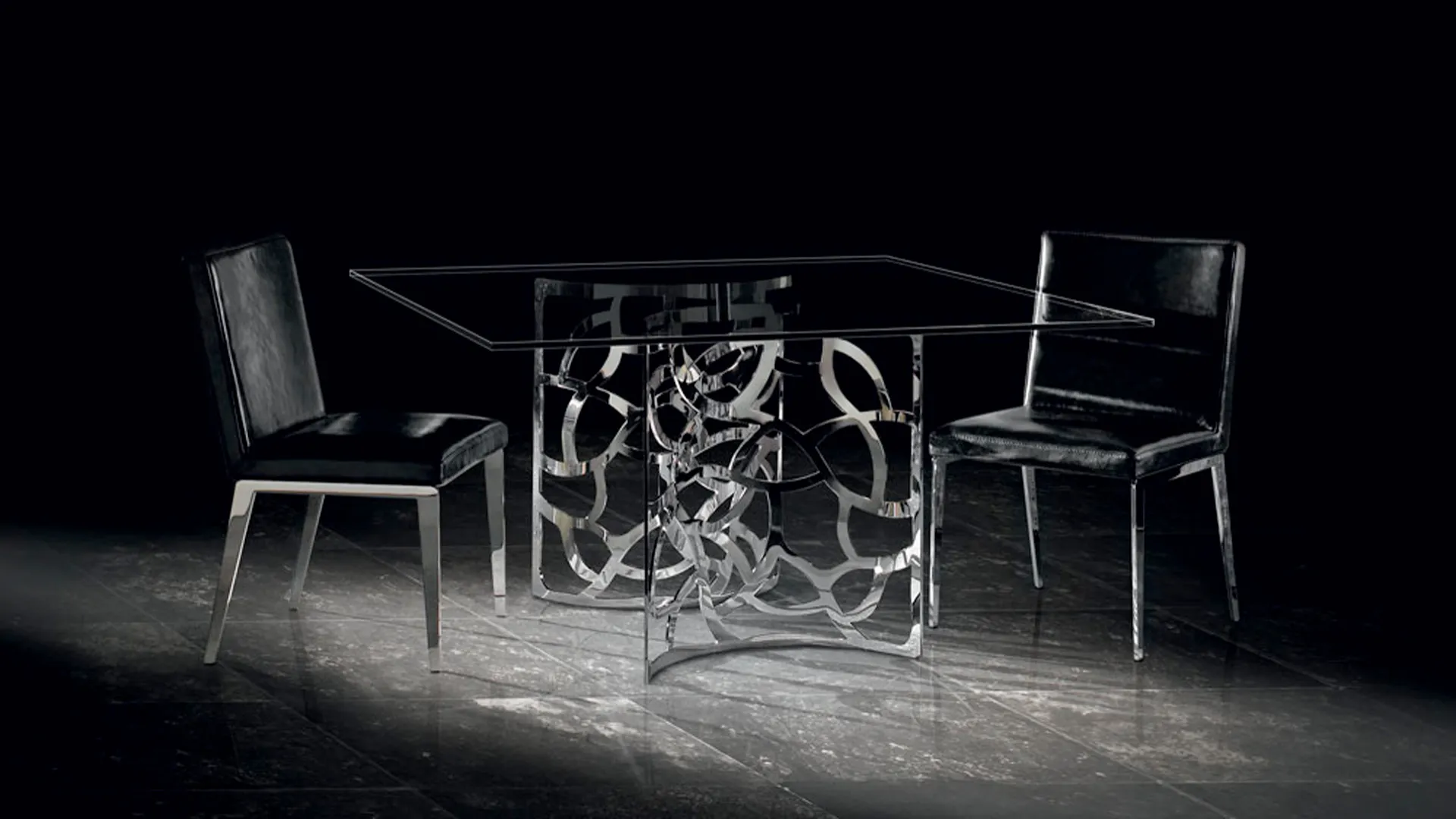 Wood and chrome steel frame, intertwined elastic belts with high rubber content. High different densities polyurethane foam filling.