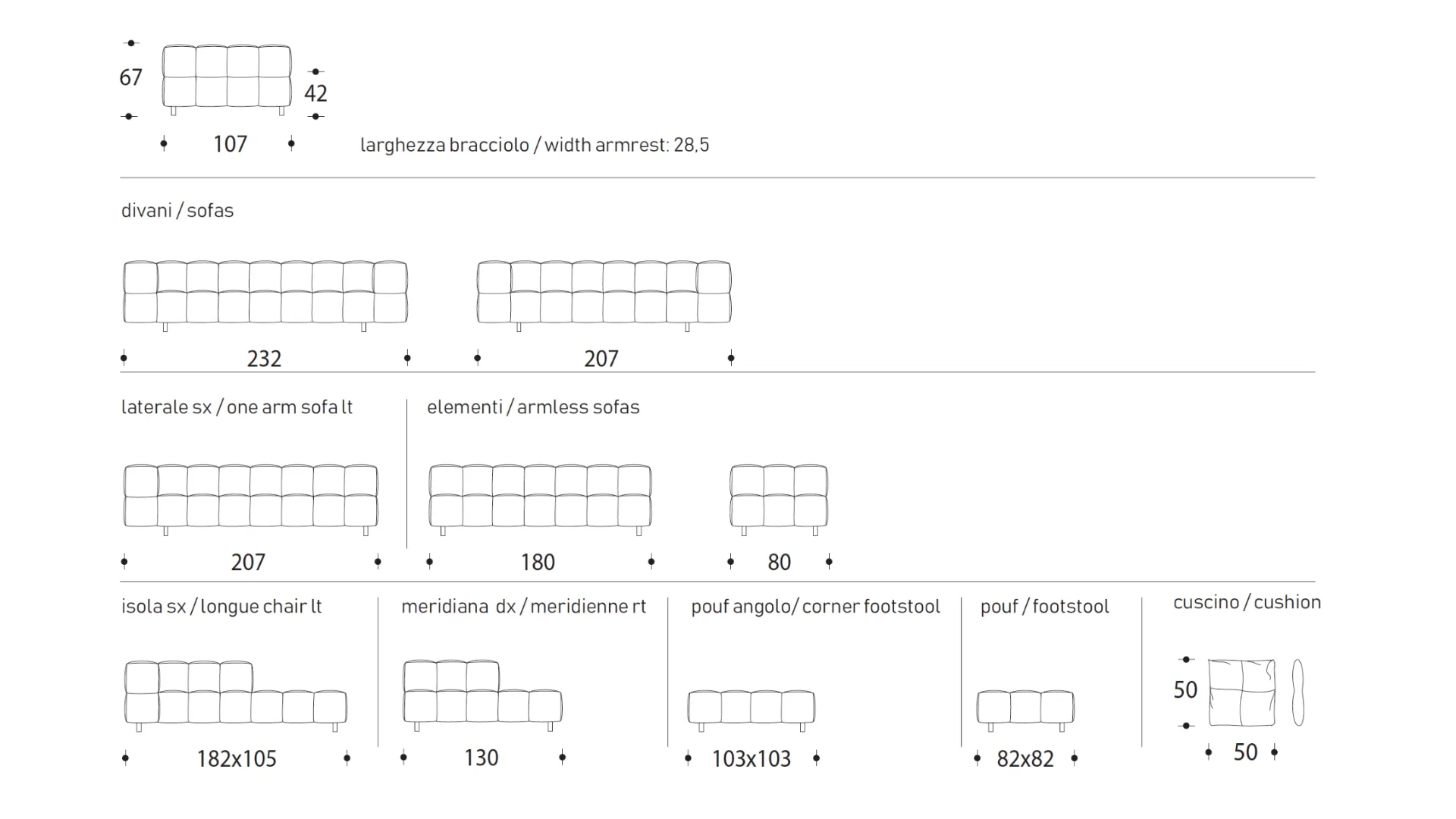 Padding: non-deformable polyurethane foam in differentiated densities, with acrylic flap sewn onto the upholstery.