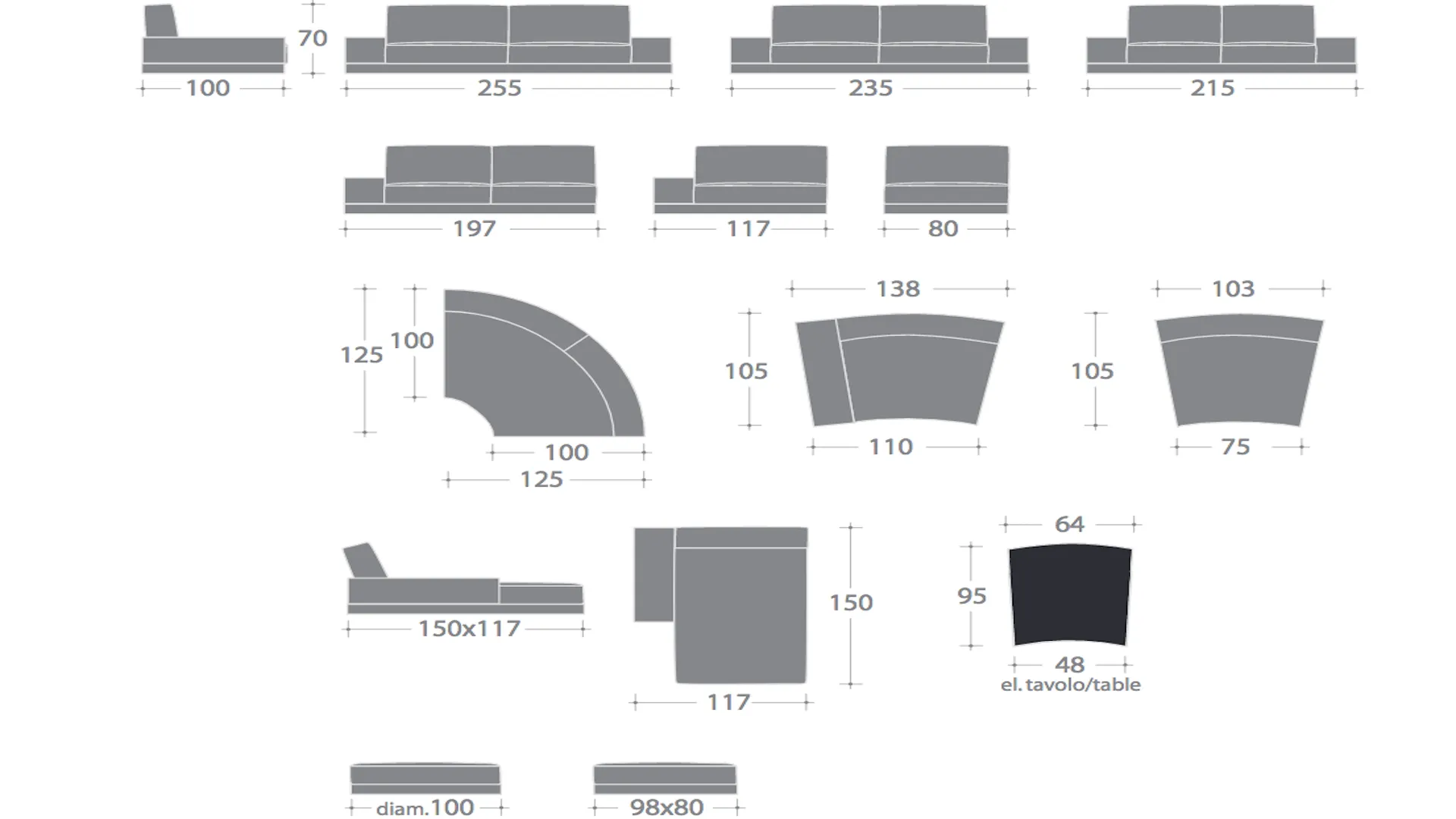 Wood frame, intertwined elastic belts with high rubber content. Cushions, armrests and backs in different densities polyurethane foam covered with goose down lining. Wood feet.