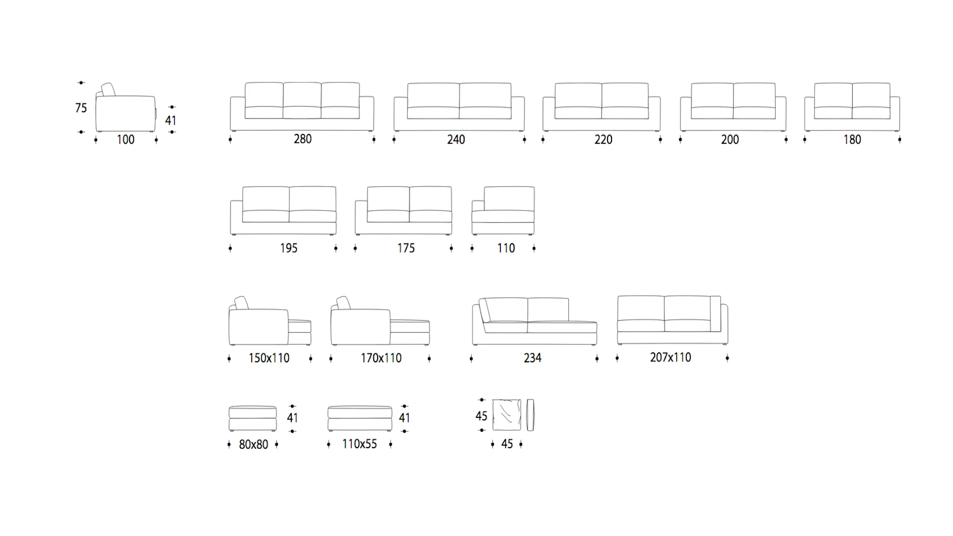 Padding: structure in polyurethane foam coated with acrylic padding. Seat cushion in 100% channeled down duvet over different density non-deforming polyurethane foam. Lining 100% cotton. Back cushion in mollapiuma (a balanced mixture of small feathers new and acrylic batting to ensure maximum softness) over different density non-deforming polyurethane foam. Lining 100% cotton. Structure: frame in different kinds of wood and support with interwoven elastic webbing, completely covered and reinforced with polypropylene. Upholstery: fabric or leather. Removable covers: fully removable covers both in fabric and in leather. Feet: varnished solid wood.