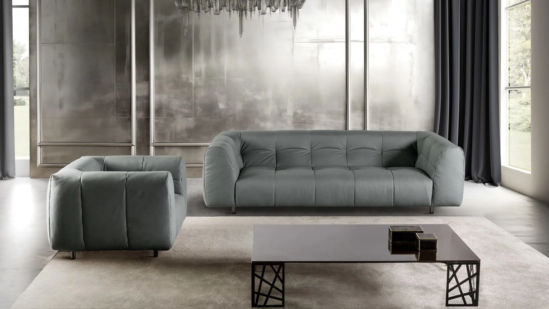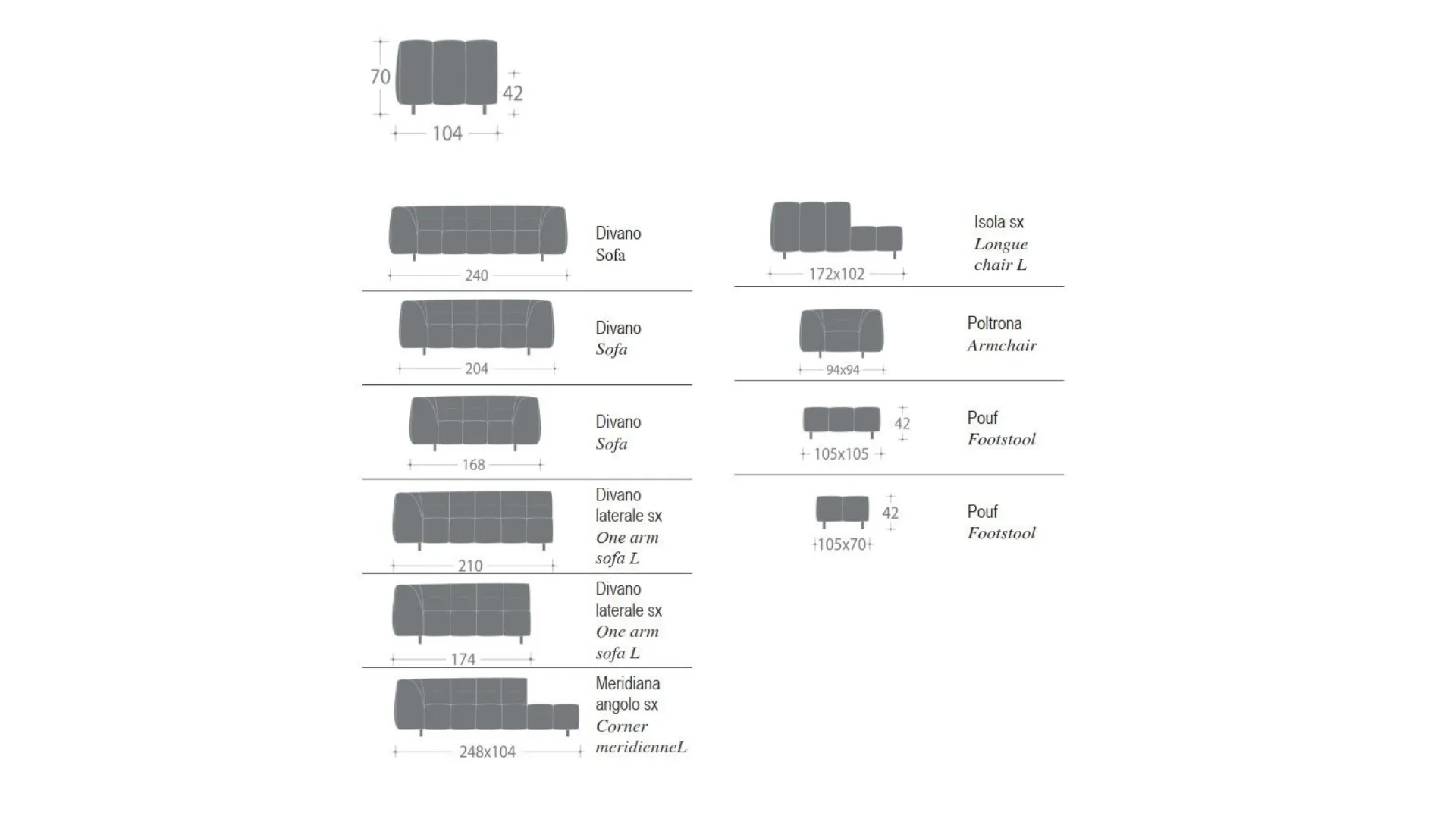 Base covered with different density non-deforming polyurethane foam. Frame in different kinds of wood and support interwoven elastic webbing completely covered and reinforced with polypropylene. Feet: dark chromiumplated metal.