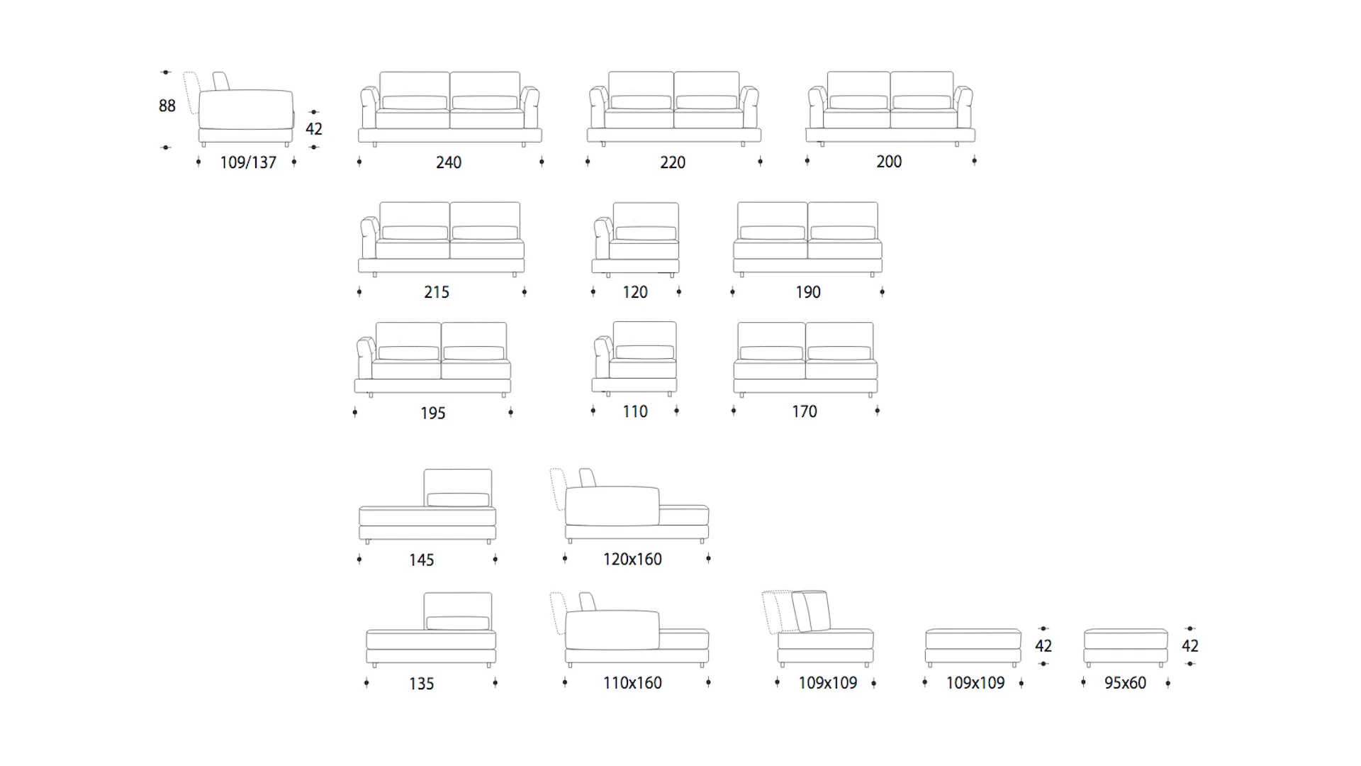 Padding: base covered with polyurethane foam. Seat cushion, armrest and kidney cushion in different density polyurethane foam coated with acrylic padding. Back cushion in polyurethane foam coated with latex quilt. Lining 100% cotton. Structure: frame in different kinds of wood and support with interwoven elastic webbing, completely covered and reinforced with polypropylene. Upholstery: fabric or leather. Removable covers: fully removable covers in fabric, back and seat cushions only in leather. Feet: dark chromium-plated steel.