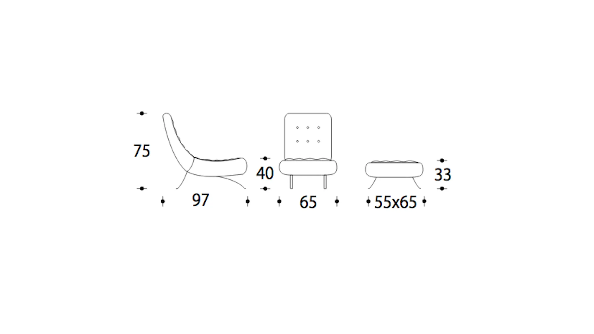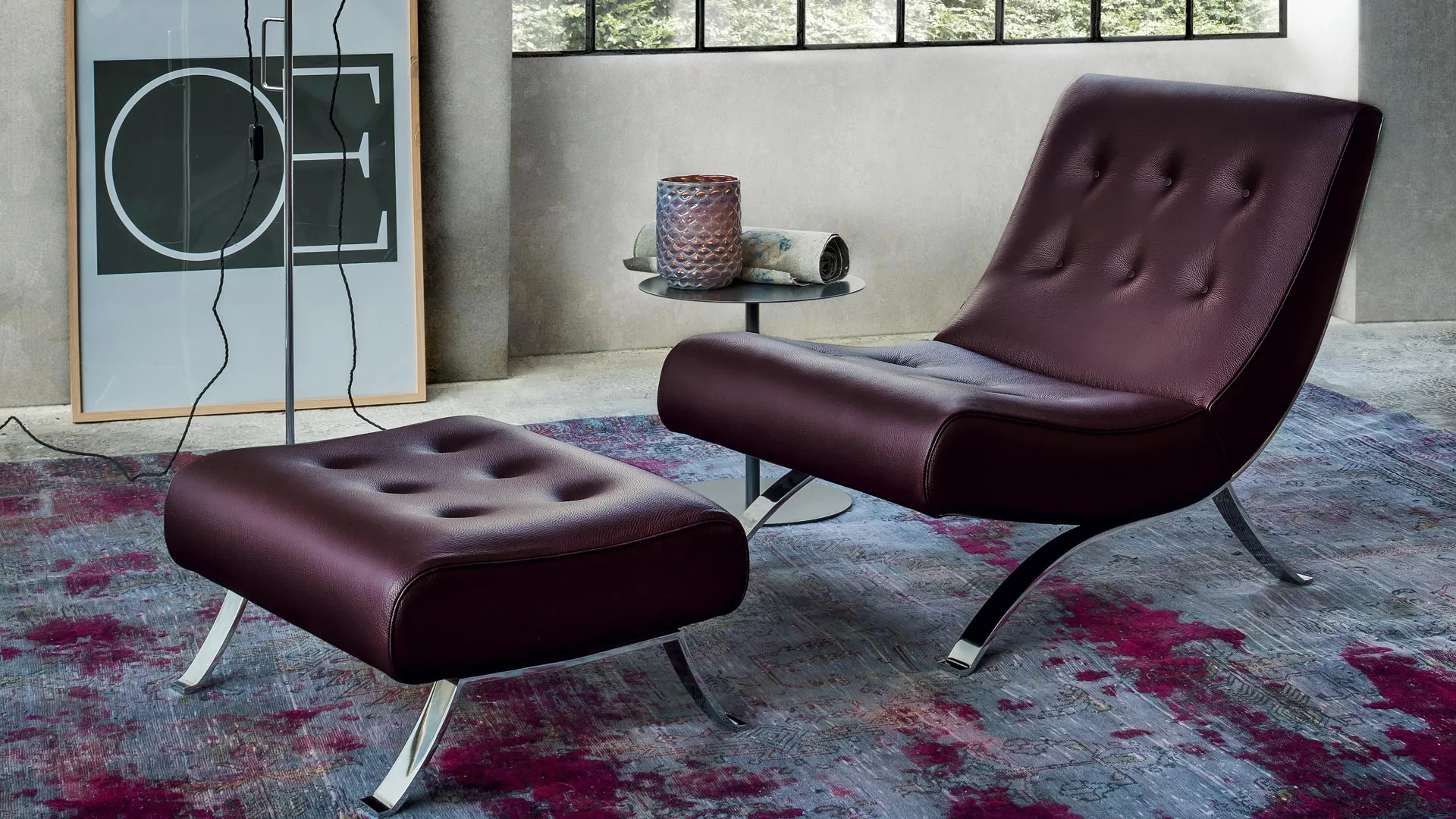 Chromium-plated structure which runs along the shape, the capitonné of the seat and the back, and the footstool which integrates the composition.